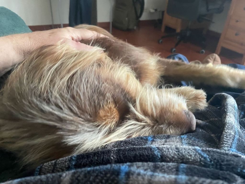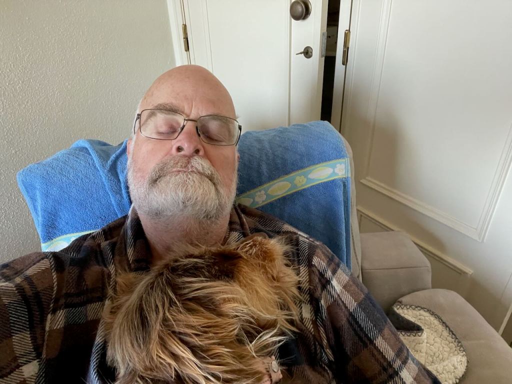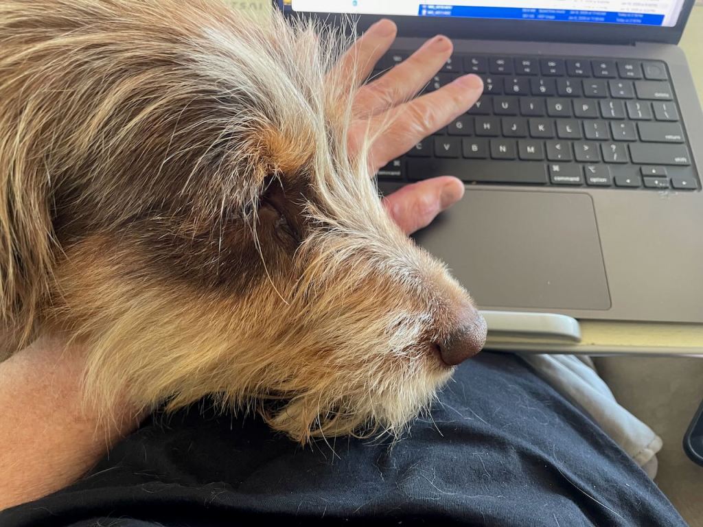 When she’s inside, whatever room I’m in, she has to be there too. I have a spiral staircase she can’t climb up, and the first time I went up it with her in the house she sat down below and barked until I came back down. And she rarely barks. When I sit in my easy chair to read the news or, say, write this blog, she’ll usually climb onto the chair, push the computer off to the side, plant her head on my chest, and start snoring within minutes. Once she does that I allow myself to be held captive because I just hate to wake her up and frankly, having another warm, breathing, living being snuggling on me is like a little slice of heaven. It takes longer for me to accomplish anything nowadays, but ah, the things we do for love.