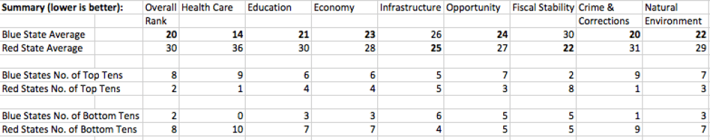 Anyway, the following is what I learned. I have all the data on a spreadsheet for anyone who wants to see my exact methodology, but in the interest of brevity and clarity, these are simply the summaries, which consist of averaging the rankings and listing the number of red and blue states in the top and bottom tens. By doing this, we can get a pretty clear and simple picture as to how red and blue states compare to each other.