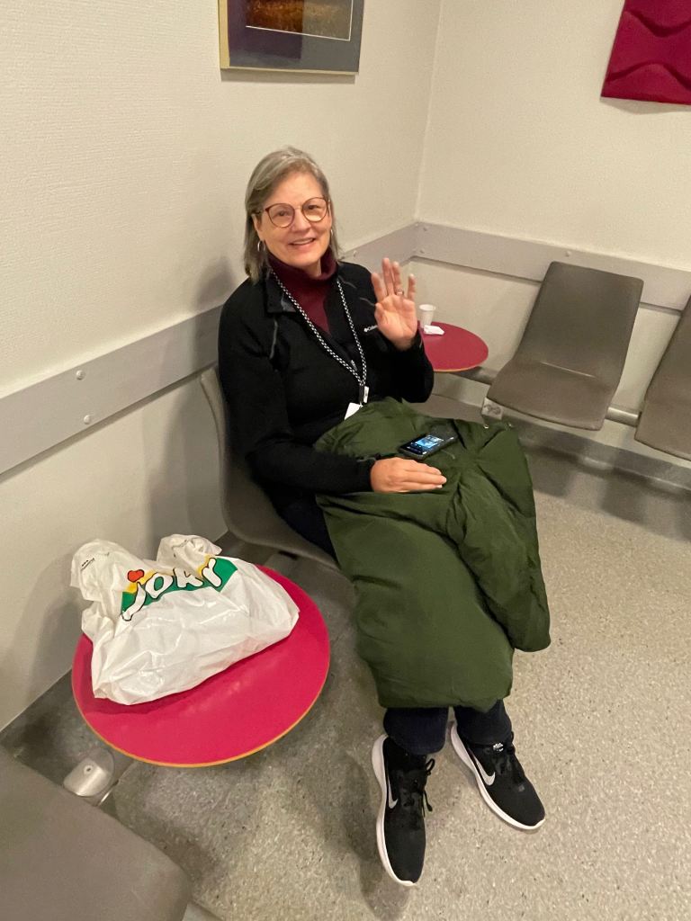 While Carolyn isn’t bipolar, she’s certainly biclumsy, because there rarely seems to be a trip we take where she doesn’t damage something on herself. This time it was a slip and fall on some ice. Keep in mind that 1) We had already purchased cleats to put over our shoes in order to avoid exactly that happening, 2) We had the cleats with us, 3) We hadn’t put them on, and 4) The accident occured after the ladies insisted they knew the way back to the ship over Tim’s objections, leading them right into an ice field where Carolyn rather unceremoniously landed on her rump. The result was the change of our next excursion into a ride in a cab to the hospital, where we were treated to the inner workings of Norwegian medicine and where we learned she had a small cracked bone in her wrist, a bruised elbow, and bad hat hair. Oy vey. She’s fine now; the doctor says she’ll live at least another few months. We did make a habit of checking out the location of every ambulance at every stop after that.