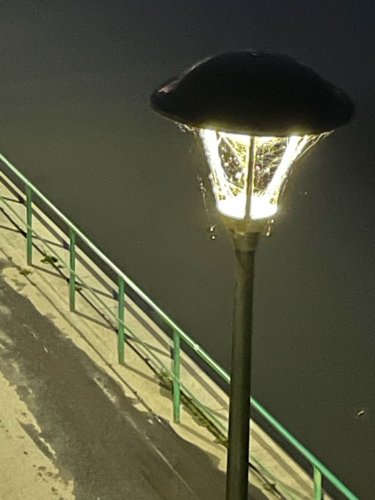 As we wandered around the area we spotted this amusement park across the water. That’s not the moon to its left, it’s a hot air balloon. We took a closer look at one of the lamps and saw that it was a feeding ground for what had to be some very fat and happy spiders. Letting them stay that way seems like a very eco-friendly way to keep the bug population down. It must work, we weren’t bugged by anything.
