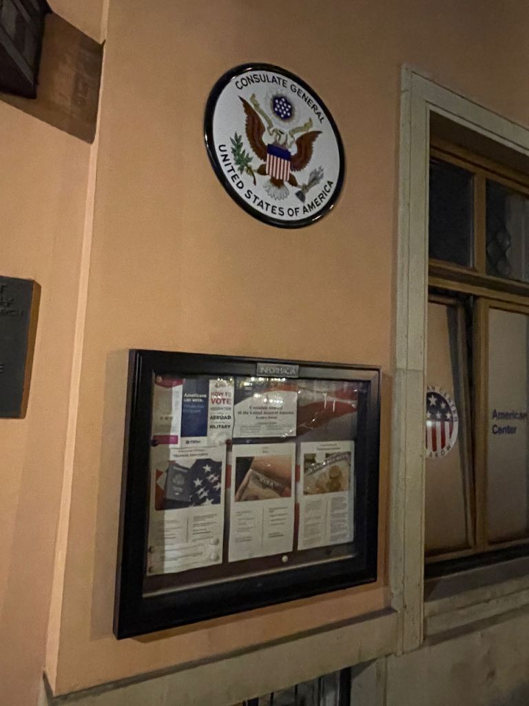 Somewhere along the way we spotted the American Consulate. I tucked its location away in my brain in case I succumbed to a desire to shoplift or beat up a local again. Of course, seeing as how my brain can only retain about the last ten minutes of information, I promptly forgot where it was and so decided I had better behave.