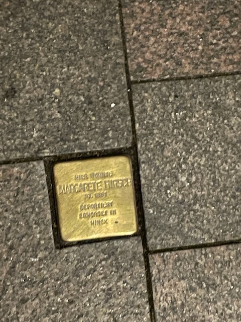 But this definitely isn’t. These small gold squares, officially called Stolpersteine (German for stumbling stones), are small brass plaques embedded in the pavement in front of houses where victims of Nazi persecution last lived freely. Each stone bears the name, birth year, and fate (deportation and death, if known) of an individual.