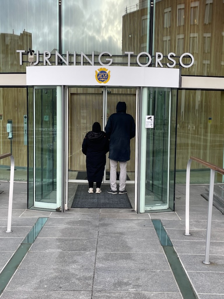 While these photos make it look like Pia and Per are turning round and round at the foot of the building, and while the building itself also looks like it turns, only the world turns. And As the World Turns, these are the Days of our Lives.
