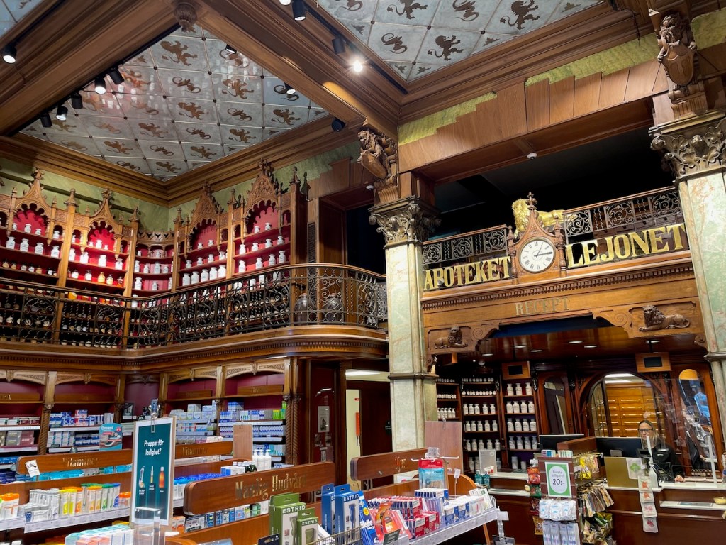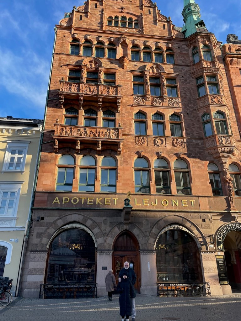 They do have a very old pharmacy, called the Apoteket Lejonet (The Lion), dating all the way back to 1571. But it can’t compete in the old-age competition with the Officina Profumo-Farmaceutica di Santa Maria Novella in Florence, Italy, which began in 1221 AD (i.e. 1221 After Der Christ). Although if you want to nitpick, after its founding, the Officina Profumo-Farmaceutica di Santa Maria Novella only serviced a bunch of monkeys for decades– er, what? Oh, monks. Sorry ’bout that. But anyway it didn’t open its doors to the public until 1612, so the Lejonet kinda beats the Officina Profumo-Farmaceutica di Santa Maria Novella on that score. And anyway, it’s remarkably beautiful and is the oldest one in Sweden, although they don’t sell Mandrake anymore and I refuse to take aspirin that’s 450 years old, so I’m not sure what good all that age does. I’m pretty certain they had a lot of expired medicines there, I’m sure just like the Officina Profumo-Farmaceutica di Santa Maria Novella, which in British English is spelled: the Officina Profumo-Farmaceutica di Santa Maria Novella.